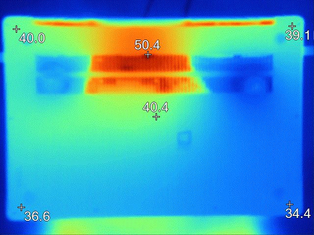 表面温度如上图所示,键盘键帽最高46.8℃出现在键盘中上部区域,WASD键区域36.7℃,方向键41.4℃。背面中心点40.4℃。
