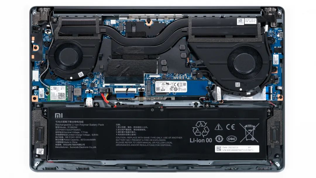 上图是小米笔记本Pro15 锐龙版 的拆机实拍图,双风扇双热管的组合,两个风扇一大一小。