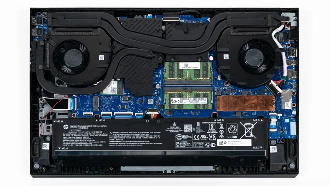 上图是惠普 暗影精灵7 Plus的拆机实拍图,4热管双风扇的组合,有一根C型热管隐藏在均热版下面。
