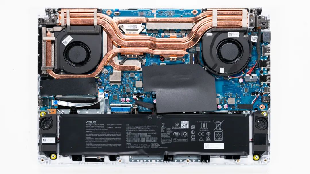 上图是华硕 天选2 高配版的拆机实拍图,四热管双风扇的组合,和原版散规格一致。