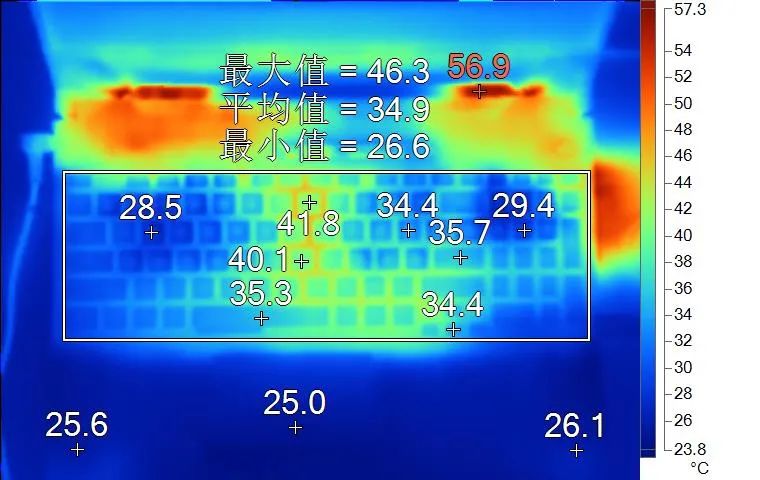 表面温度如上图所示,键盘键帽最高41.8℃出现在中部,WASD键附近约为28.5℃,方向键34.4℃。
