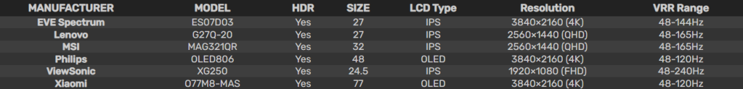 6 款新增的 G-SYNC 兼容显示器: