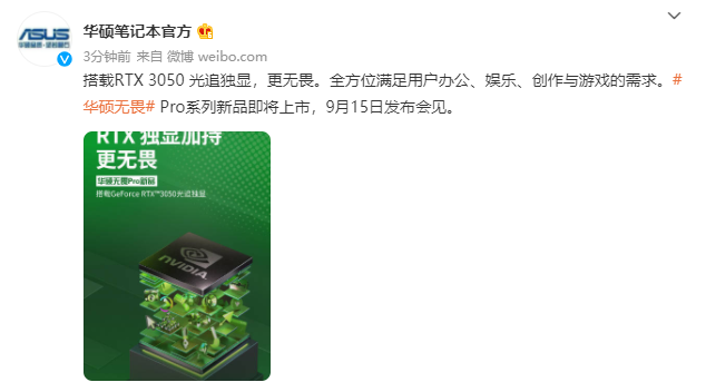 今日下午,华硕官方微博为新款华硕无畏 Pro 笔记本预热,该笔记本将搭载 RTX 3050 光追独显。