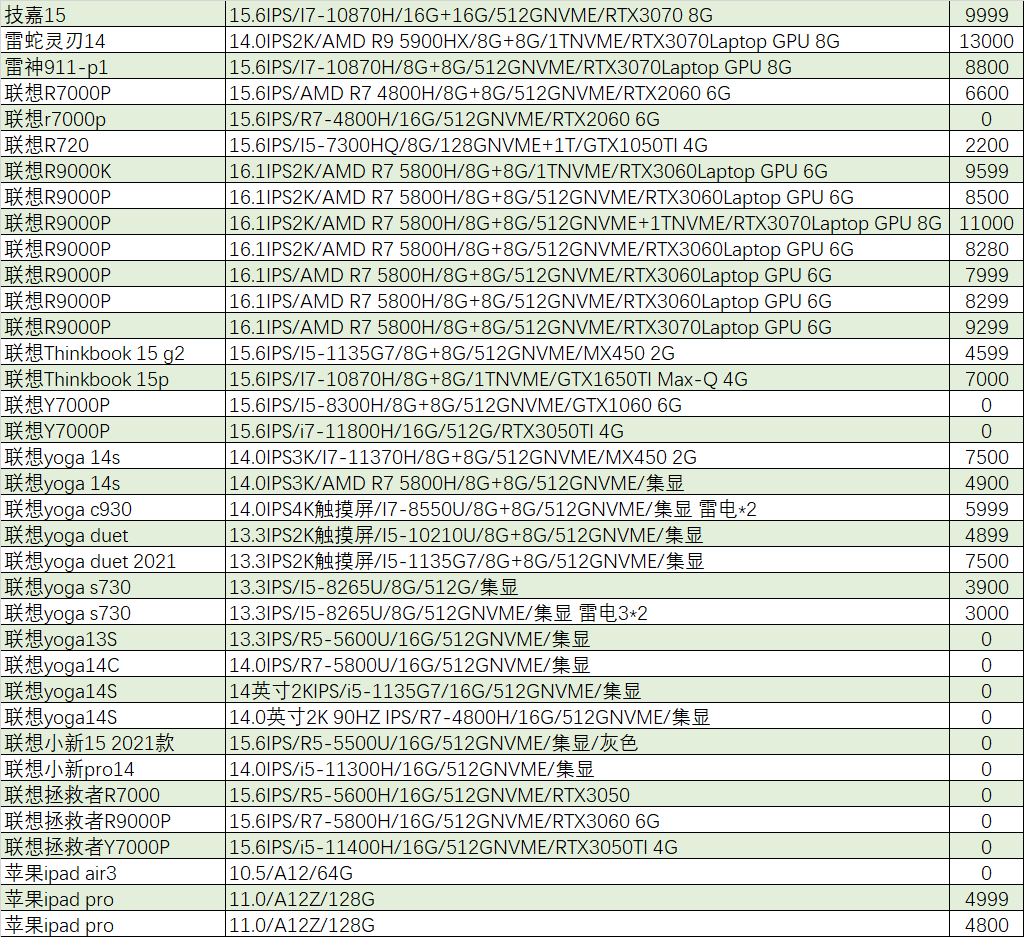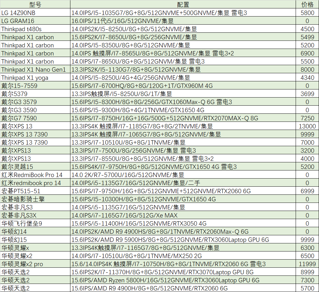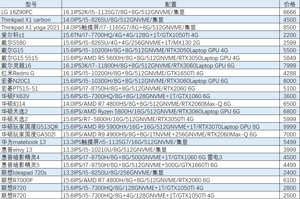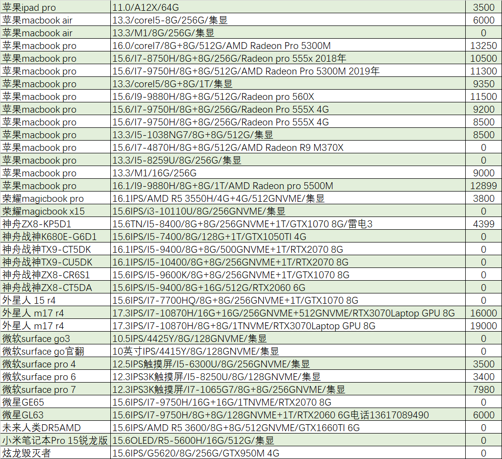 上周已售出机型:(无法列出成色,价格仅供参考)