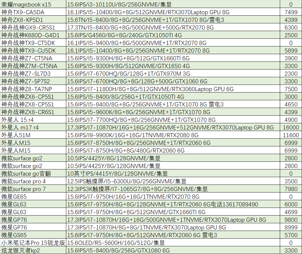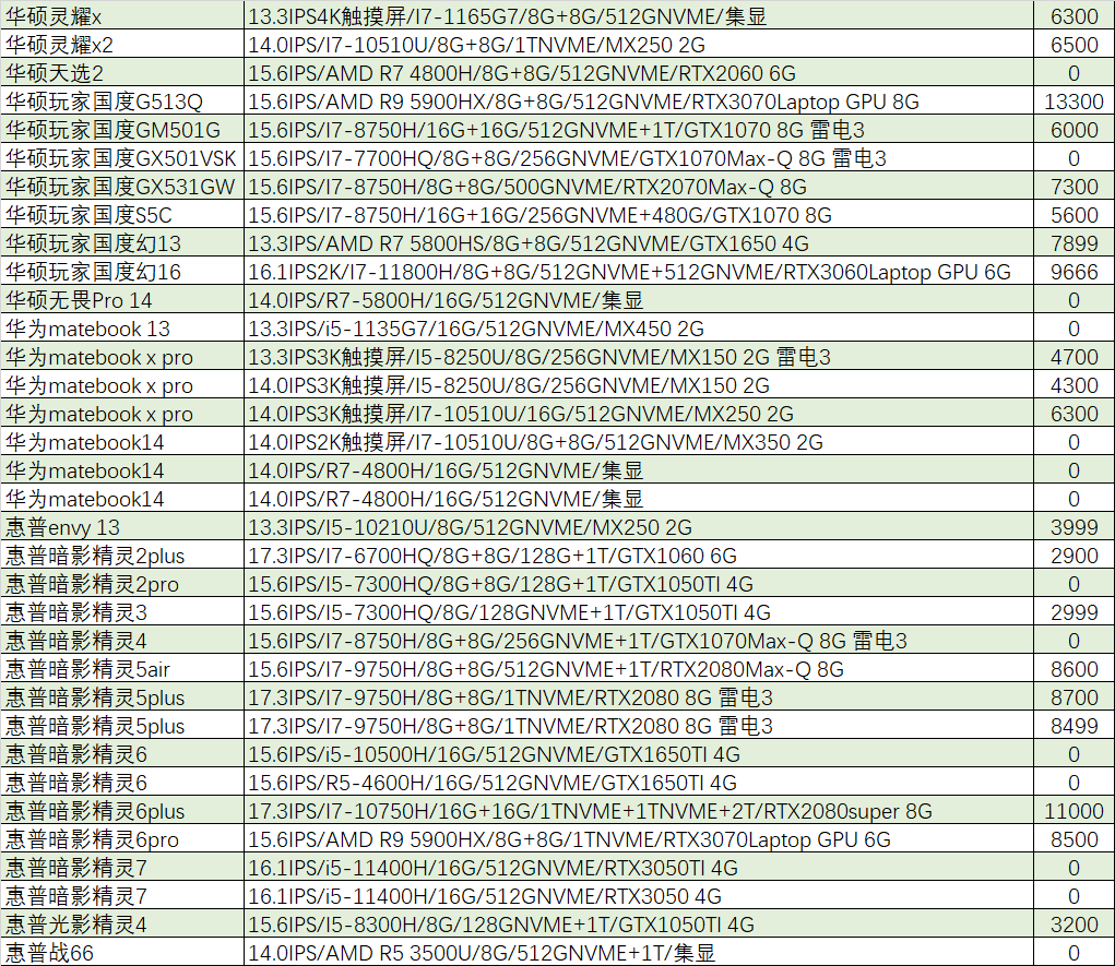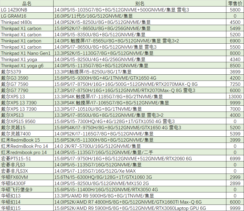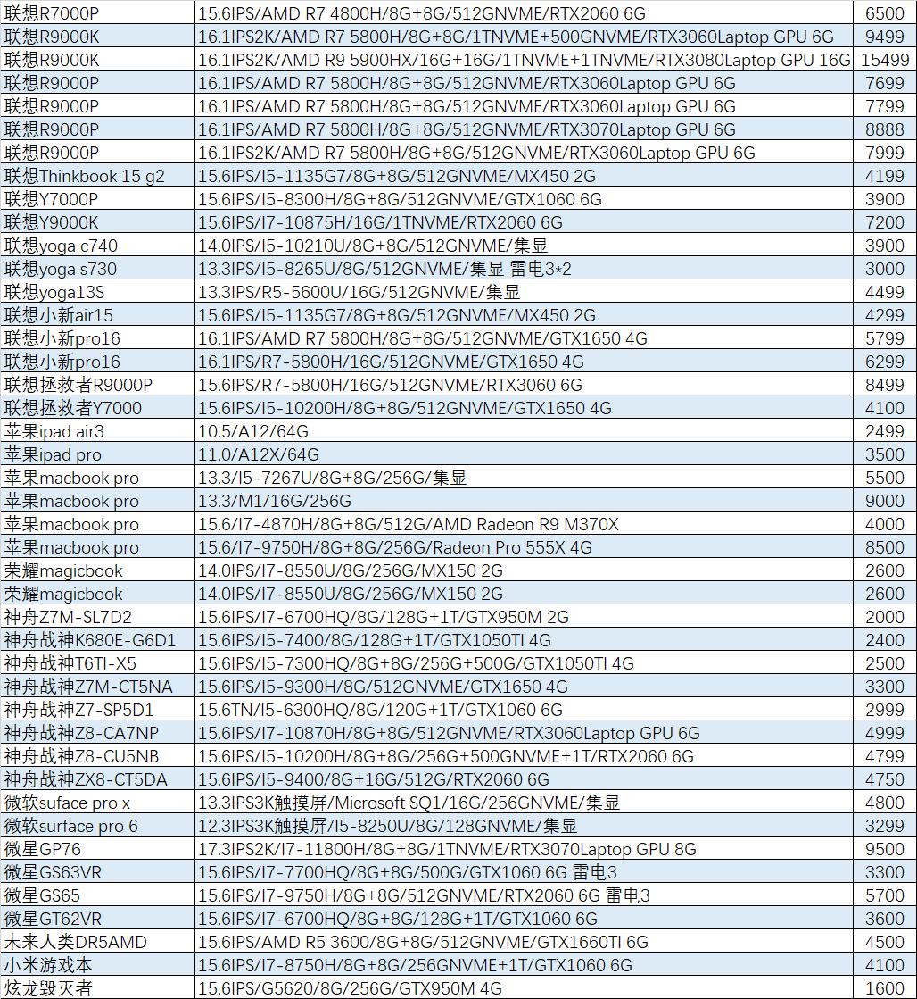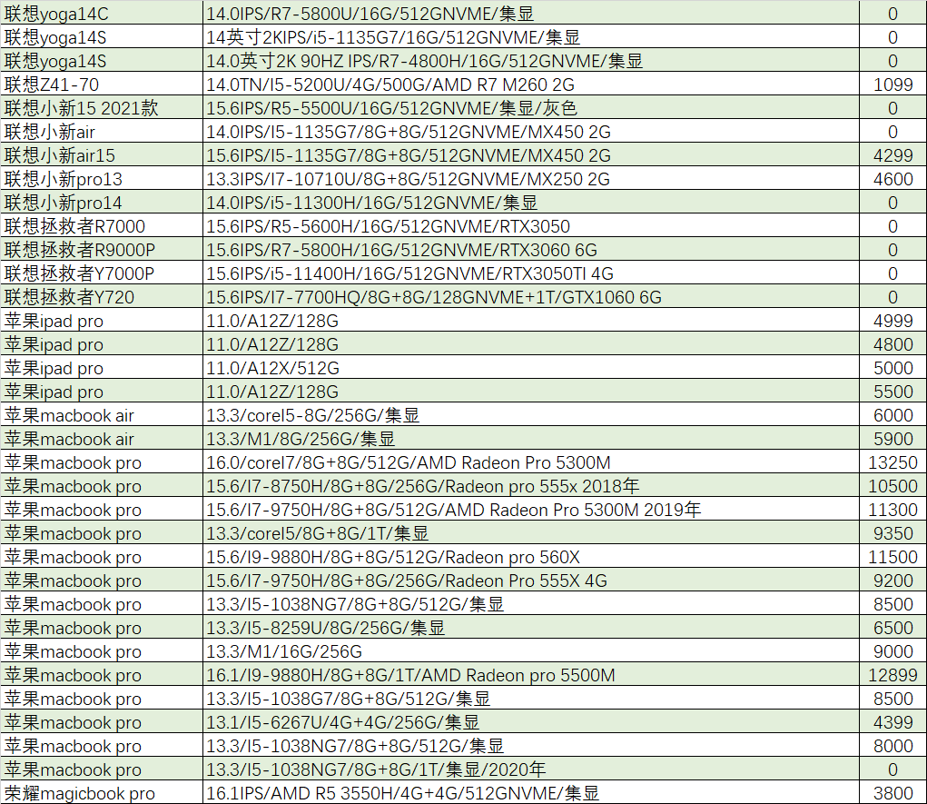 上周已售出机型:(无法列出成色,价格仅供参考)