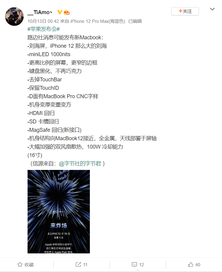 另外还有微博博主爆料称,新款 MacBook Pro 的刘海类似 iPhone 12 版。拥有更高比例的屏幕,更窄的边框。还有大幅加强的双风扇散热,100W 冷却能力。