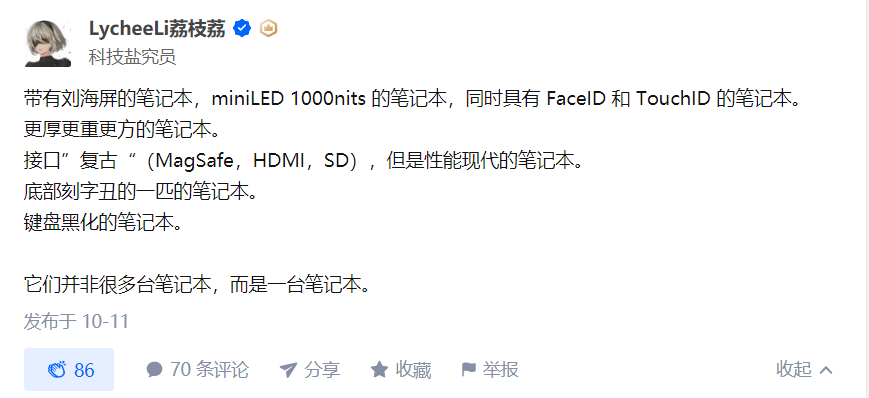 知乎用户 @ LycheeLi 荔枝荔 表示,新款 MacBook Pro 是带有刘海屏的笔记本,miniLED 1000nits 屏幕,同时具有 Face ID 和 Touch ID,更厚更重更方,接口包括 MagSafe、HDMI、SD,性能现代。底部刻字,键盘黑化。