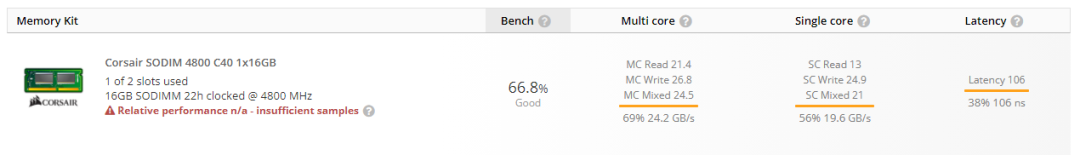 由于 DDR5 内存支持单条双通道,且频率更高,因此理论上内存跑分成绩应该明显高于 DDR4,但是从本次跑分成绩来看,测试平台似乎未启用 DDR5 内存的双通道支持,因此内存称测试成绩不高,延迟也更大。