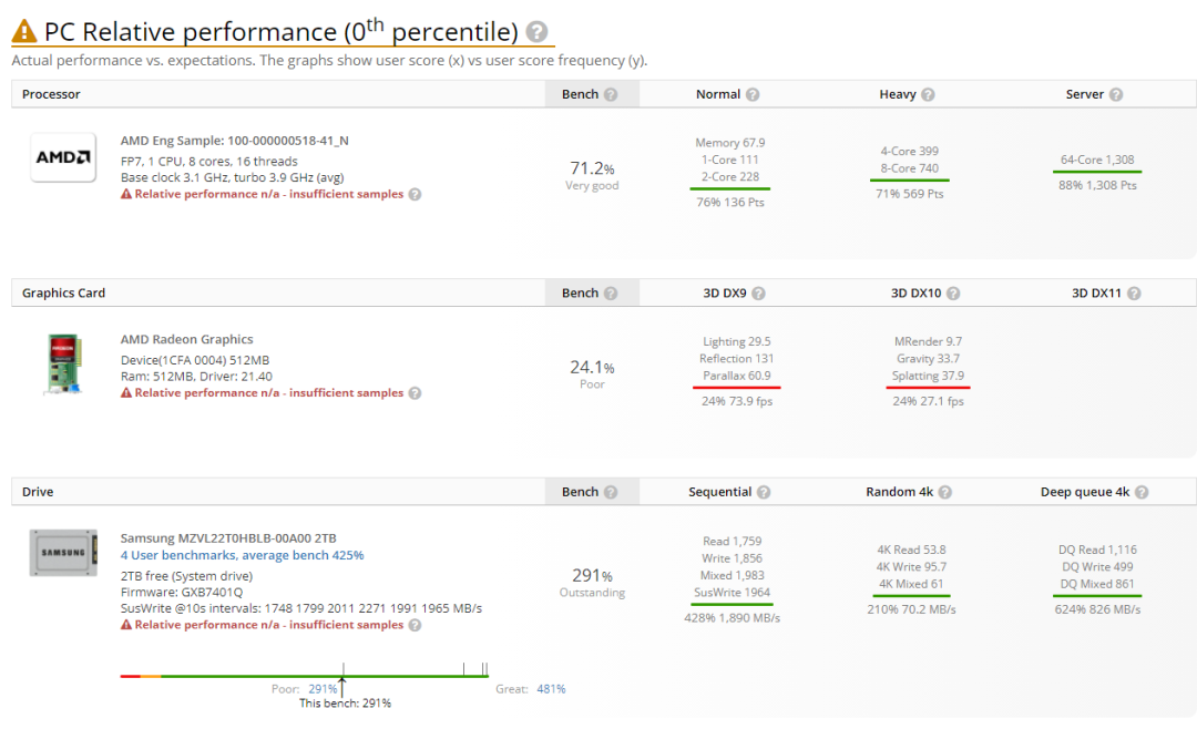 由于 AMD 这款锐龙 6000 系处理器为工程版本,因此实际跑分性能不及目前在售的 R7-5800H,也不及英特尔 i7-11800H 等处理器。外媒制作了跑分对比表格: