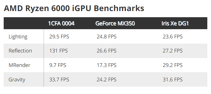 IT之家了解到,AMD 此款处理器预计将搭载 RDNA 2 架构核心显卡。跑分结果显示,核显代号“1CFA 0004”具有 512MB 共享显存,其多个项目成绩均超过了英伟达 GeForce MX350,以及英特尔锐炬 Xe DG1。如果消息属实,AMD 在这一代移动处理器终于换掉了祖传的 Vega 核显,一些轻薄本无需搭载独立显卡即可实现初级的图形性能。