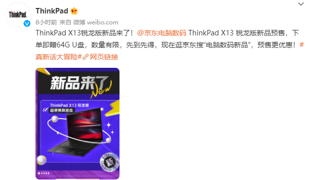 IT之家了解到,联想 ThinkPad X13 锐龙版现已在京东上架,预售价格为 5999 元,定金为 200 元。