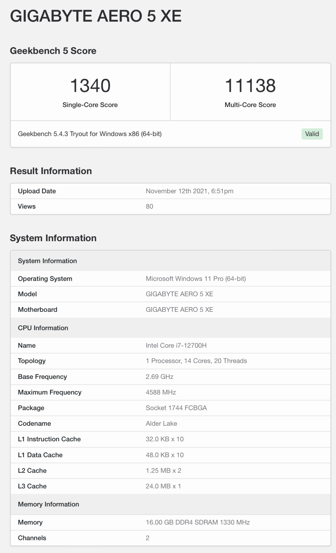 技嘉新款 AERO 5 XE 游戏本现身 Geekbench,搭载了英特尔尚未发布的 i7-12700H,多核跑分达到 11138 分。