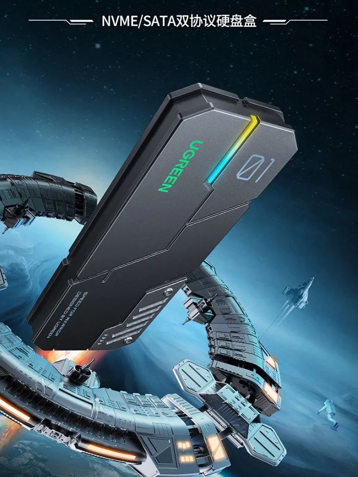 绿联于 11 月 12 日推出一款支持 NVMe/NGFF 双标准的 M.2 移动硬盘盒。这款产品采用机甲风格的造型,正面有着金属点缀、RGB 灯光,采用 Type-C 接口连接。