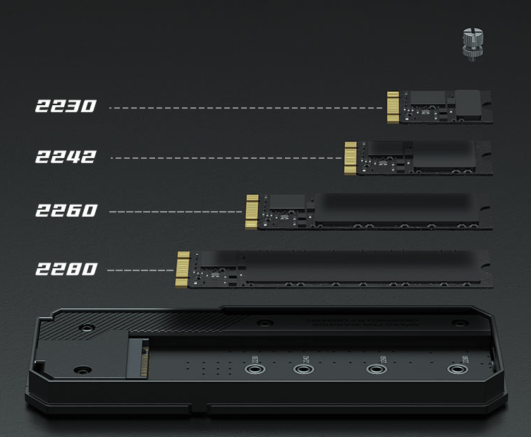 操作方面,这款硬盘盒采用无螺丝设计,滑动银色的模块即可拆卸硬盘。产品内部拥有多个螺丝位,兼容 2230、2242、2260、2280 多种规格的固态硬盘。硬盘盒本体为铝制,结合内部的导热垫可以保证固态硬盘的散热效果,防止产品因为过热而降速。