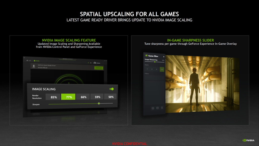 英伟达称,两年多来,NVIDIA 一直通过 NVIDIA 控制面板提供基于驱动的空间缩放器,即 NIS,该技术为所有游戏提供锐化和缩放,而无需游戏开发者整合。借助全新的 11 月版 Game Ready 驱动,NVIDIA 对缩放和锐化算法进行更新,并使其更容易通过 GeForce Experience 进行访问。