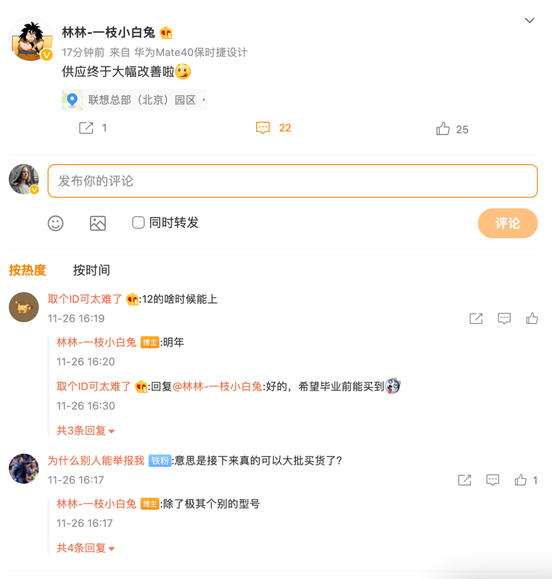 今天下午,中国区消费笔记本产品营销总监林林在社交平台表示“供应终于大幅改善啦”。