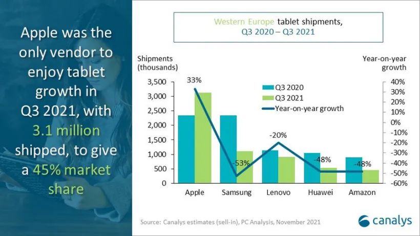 平板电脑方面,第三季度西欧市场平板出货量缩减了 20%,达到 690 万台。其中苹果占比遥遥领先,iPad 出货量超过 300 万台,增长 33%。三星、联想、华为、亚马逊位列二至五名,平板出货量不足苹果的一半。研究人员表示,苹果供应链的整合能力,保证了产品出货量不会下滑。