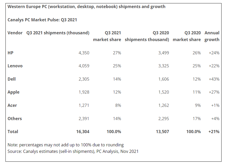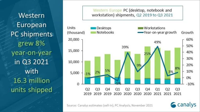 市场研究机构 Canalys 今日公布了 2021 年第三季度西欧 PC 市场出货报告。统计结果涵盖台式机、工作站、笔记本。该地区在这一季度出货量达到了 1630 万台,同比增幅达 21%,而中国大陆同期数据为 1500 万台。