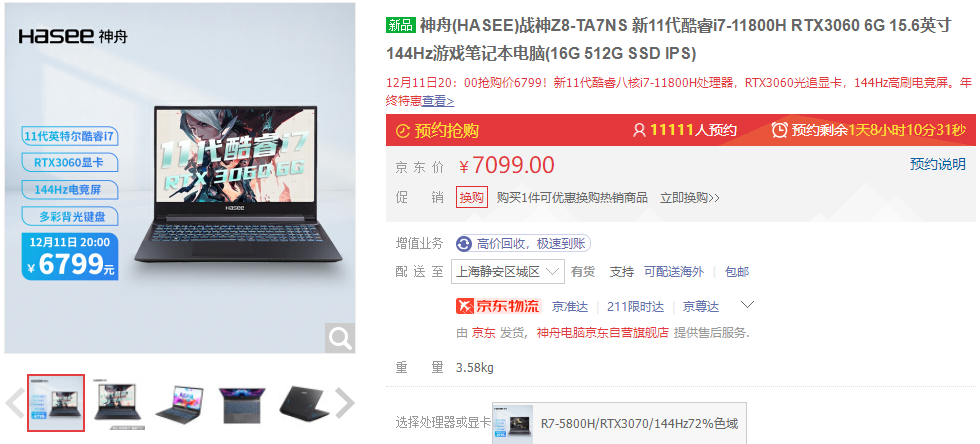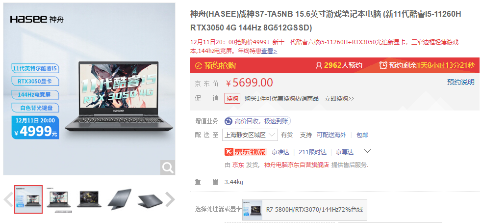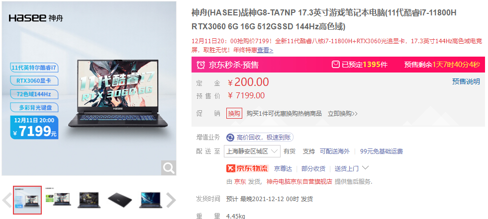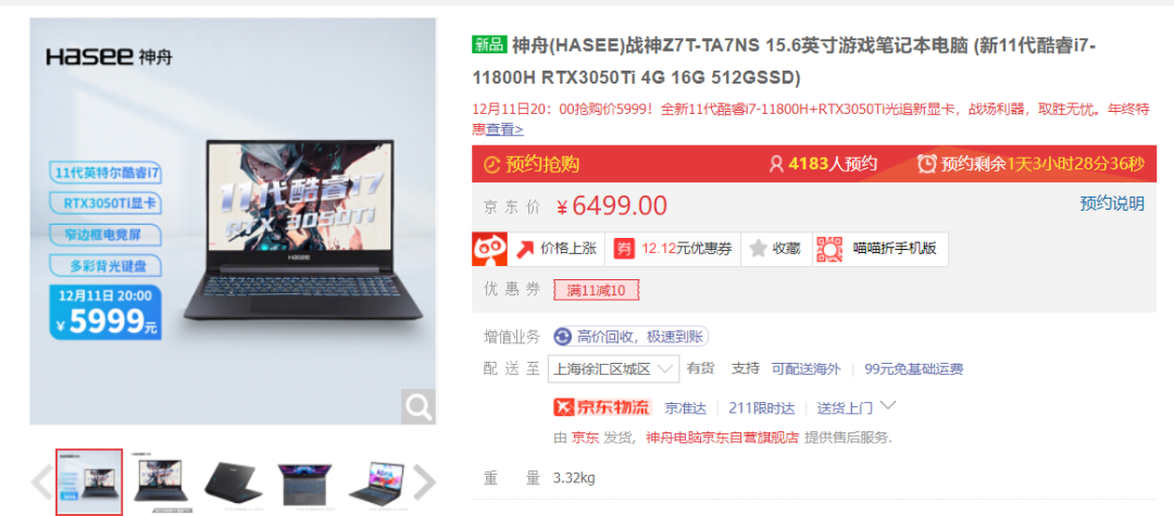 京东搜索[神舟电脑京东自营旗舰店],12月11日20:00~12日24:00开启抢购!