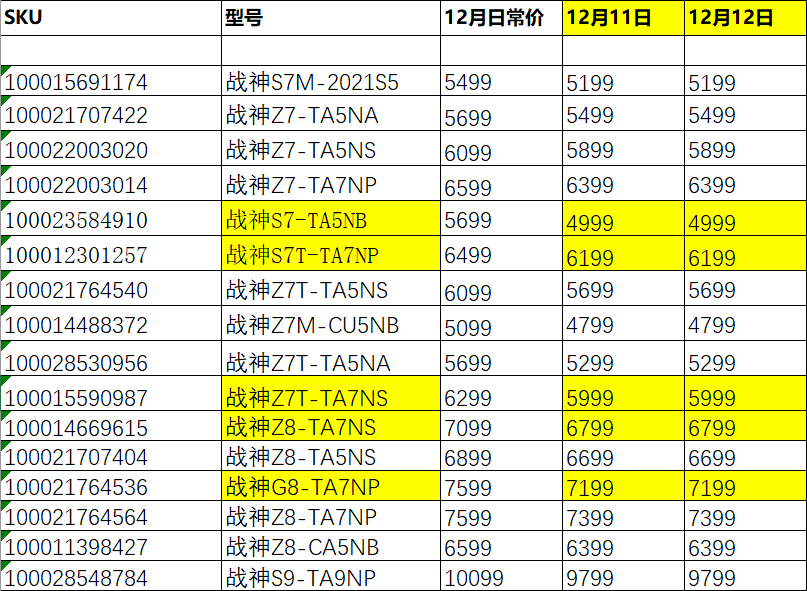 上图是神舟 战神系列游戏本双12期间的促销价格表。