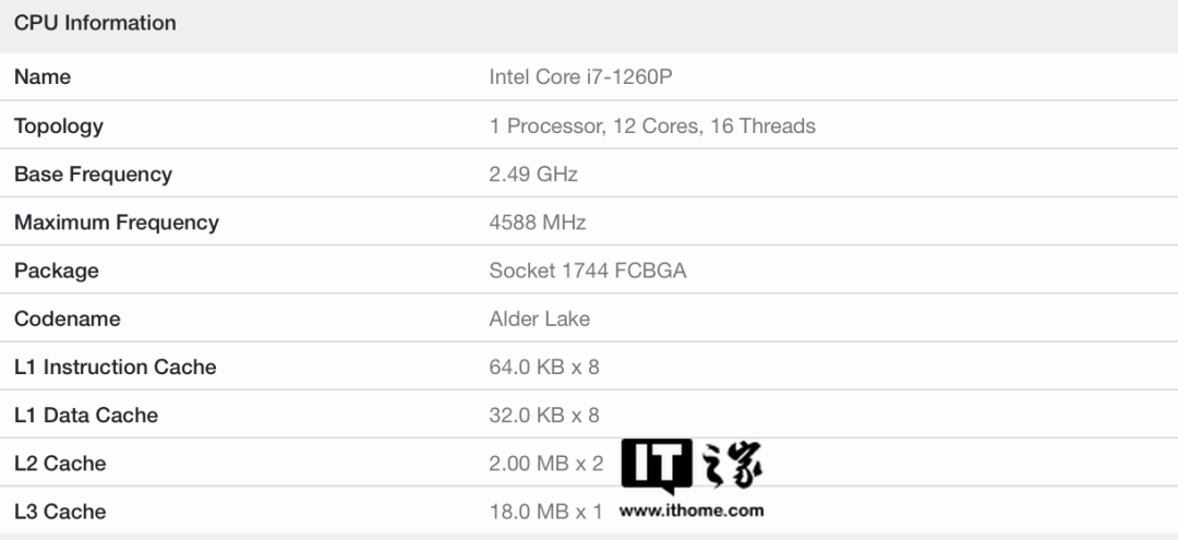 i7-1260p 已经曝光多次,4 大核 8 小核设计,2.5-4.6GHz,18MB 三级缓存。