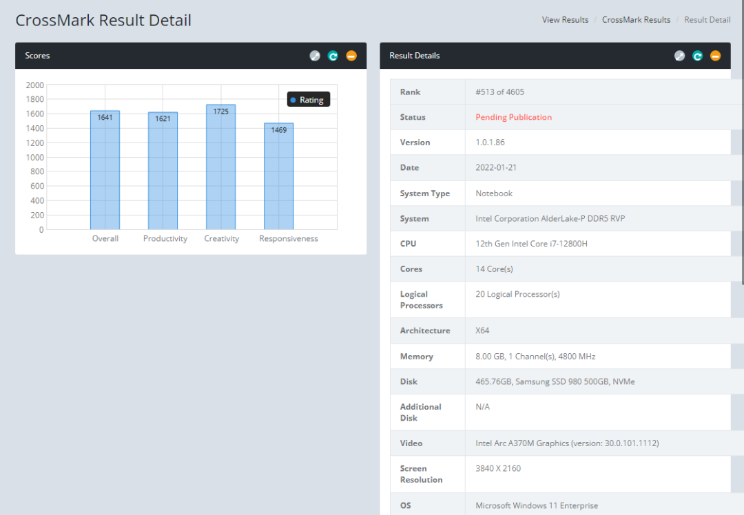 这款显卡针对笔记本电脑设计,属于正式版,名称已经确定。笔记本搭载英特尔 i7-12800H 处理器,配备 8GB DDR5 内存进行跑分,电脑屏幕为 4K 分辨率。值得注意的是,Arc A370M 搭配的驱动为 30.0.101.1112 正式版,这意味着产品已经正式成型,有望于近期发布。