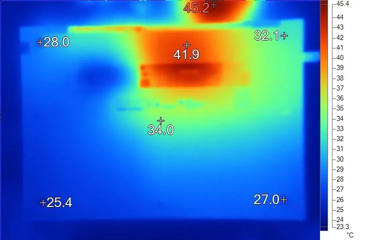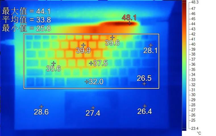 表面温度如上图所示,键盘键帽最高39.9℃出现在数字键6附近,WASD键为35.6℃,方向键26.4℃。左腕托温度为28.6℃,背面中心点34℃。