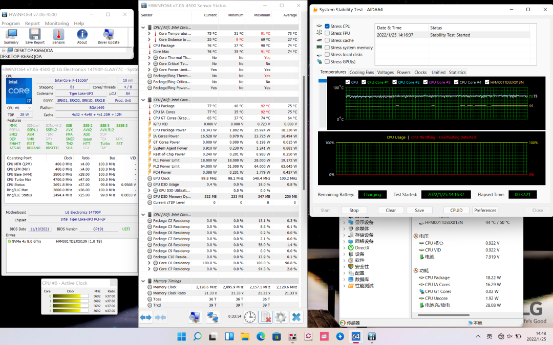 如果开启性能模式,CPU温度最高92℃,稳定在77℃,功耗18W,频率维持在3.7GHz。