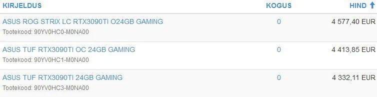 正如 @momomo_us 在推特上所说,零售商泄露的清单显示三款华硕 ROG 和 TUF RTX 3090 Ti 价格非常夸张,将超过 4332 欧元(约 31536.96 元人民币)或更高。