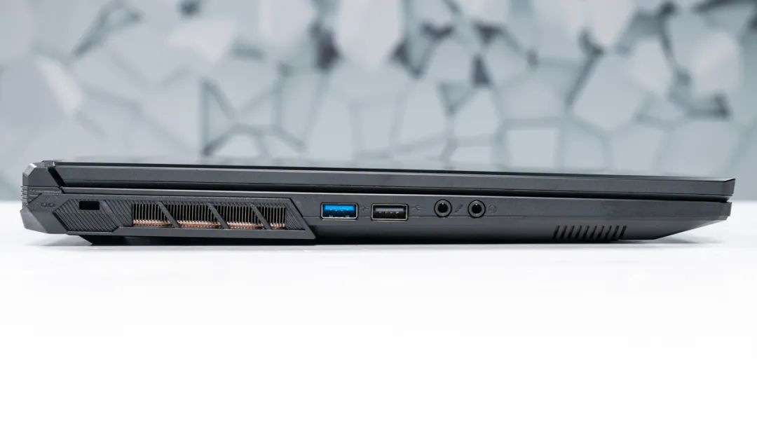 接口方面,机身左侧依次为防盗锁扣、USB3.2 Gen1 Type-A、USB2.0,以及耳机麦克风接口;