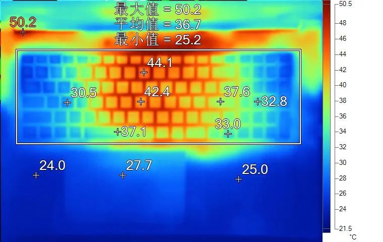 表面温度如上图所示,键盘键帽最高44.1℃出现在中上方,WASD键附近约为42.4℃,方向键33.0℃。左腕托温度为24.0℃。