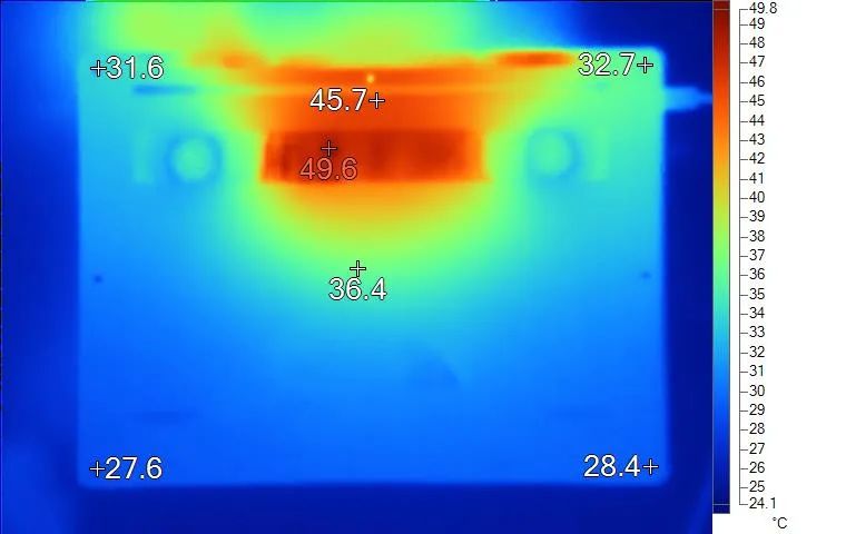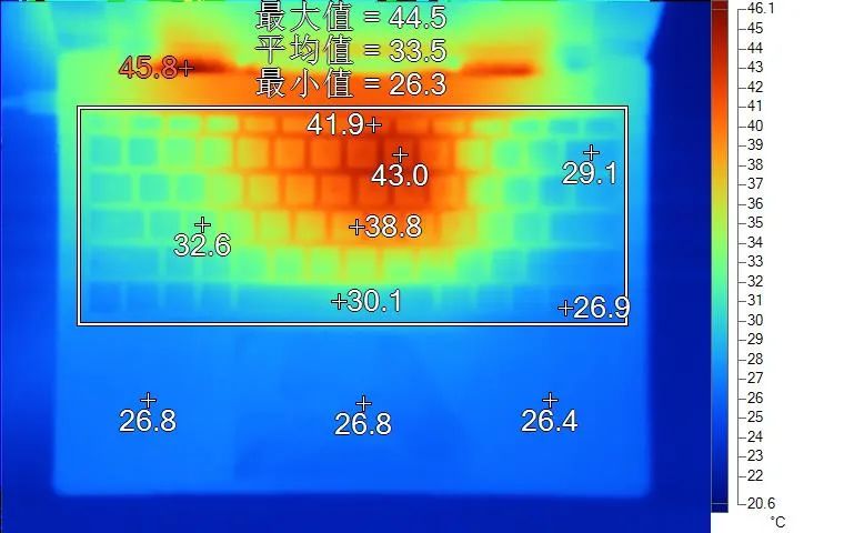表面温度如上图所示,键盘键帽最高43℃出现在键盘数字键区域,WASD键为32.6℃,方向键26.9℃。左腕托温度为26.8℃,背面中心点36.4℃。