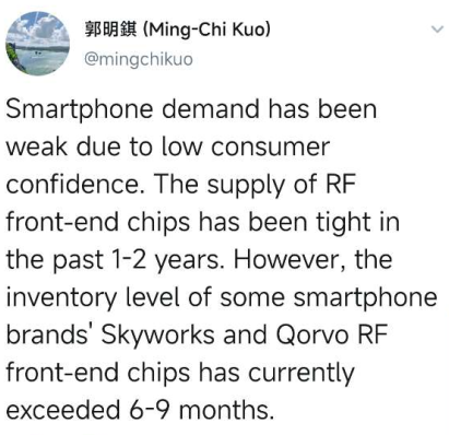 此外,郭明錤表示,由于消费者信心不足,智能手机需求疲软。过去 1-2 年射频前端芯片供应紧张,然而,目前部分智能手机品牌的 Skyworks 和 Qorvo 射频前端芯片的库存水平已超过 6-9 个月。