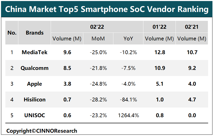 报告指出,2 月中国智能机 SoC 细分市场中,高通与紫光展锐环比降幅小于整体市场平均,高通环比降幅约为 21.8%;同时,海思降幅最大,约为 28.2%;联发科降幅第二,约为 25%。