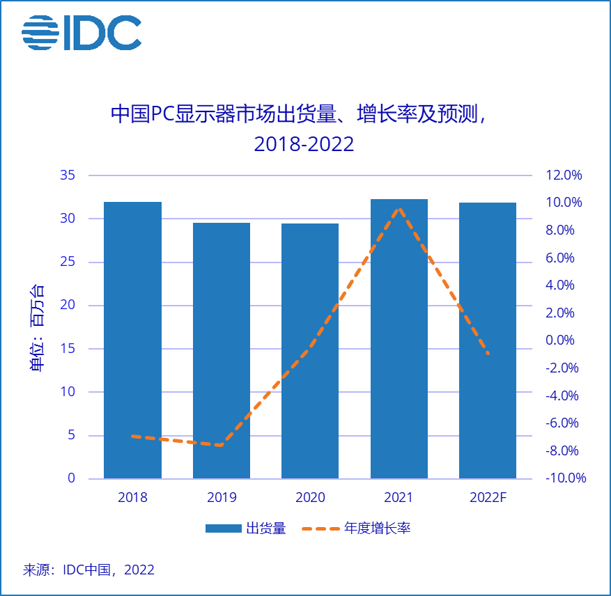 IDC 预计,2022 年中国 PC 显示器出货量不足 3200 万,同比下滑 1.4%。