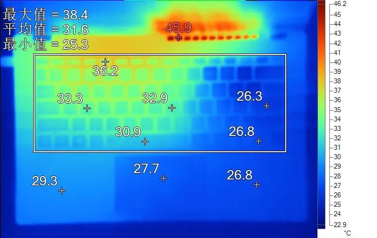 表面温度如上图所示,键盘键帽最高36.2℃出现在键盘左上位置,WASD键区域为33.3℃,方向键26.8℃。左腕托温度为29.3℃,背面中心点34.9℃。