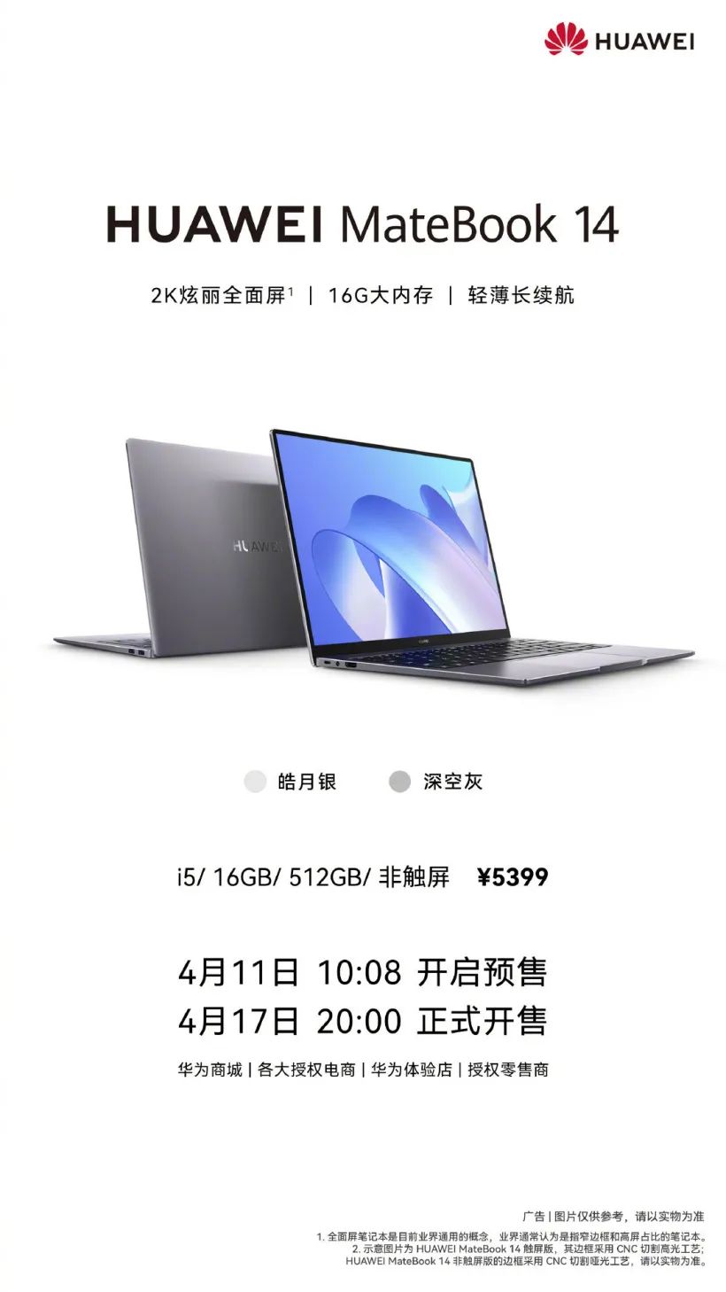 华为 MateBook 14 非触屏版已于10:08 开启预售,4 月 17 日 20:00 正式开售,售价 5399 元。