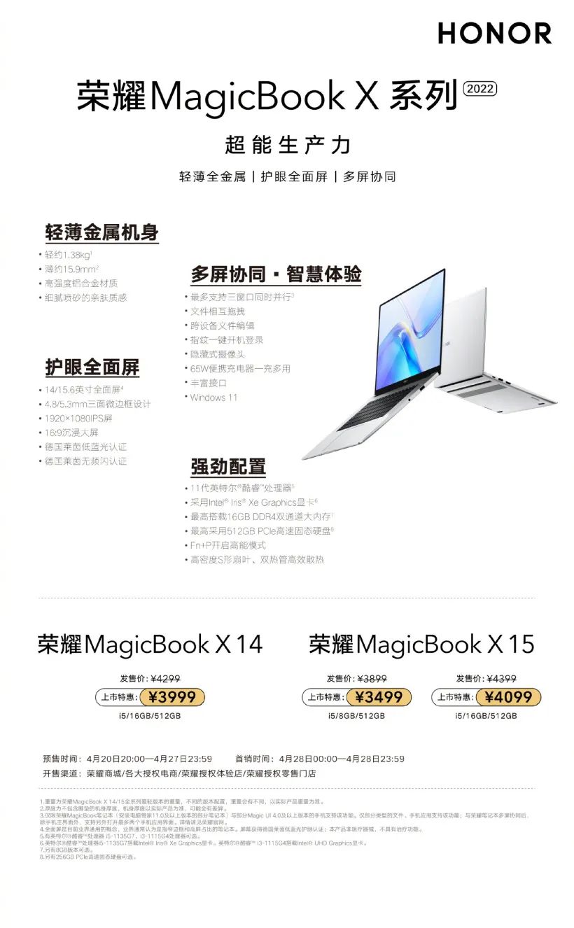 荣耀 2022 款 MagicBook X 系列笔记本发布:搭载 11 代酷睿,3499 元起