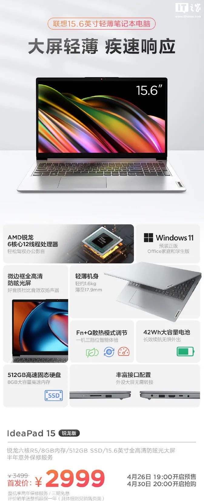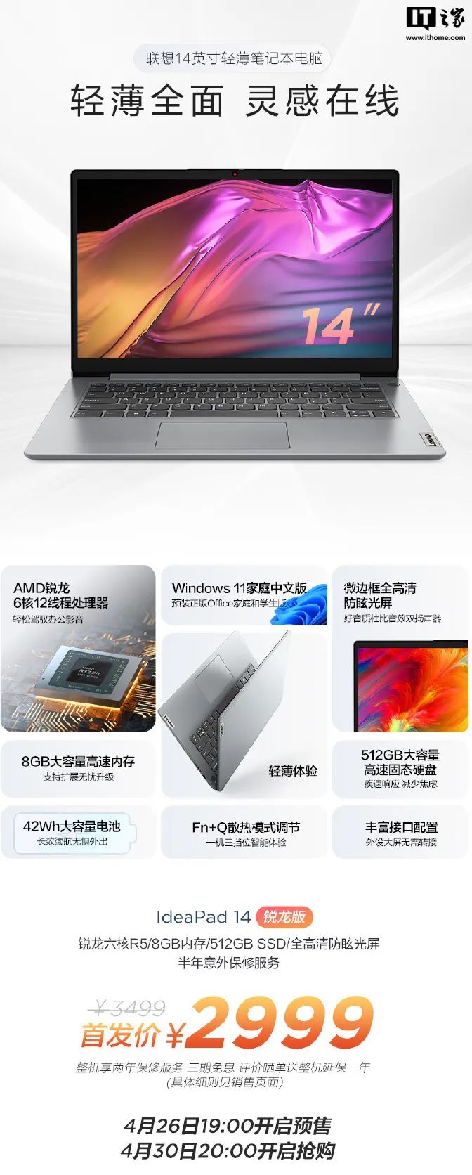 联想推出 IdeaPad 14/15 锐龙版入门级笔记本,首发 2999 元