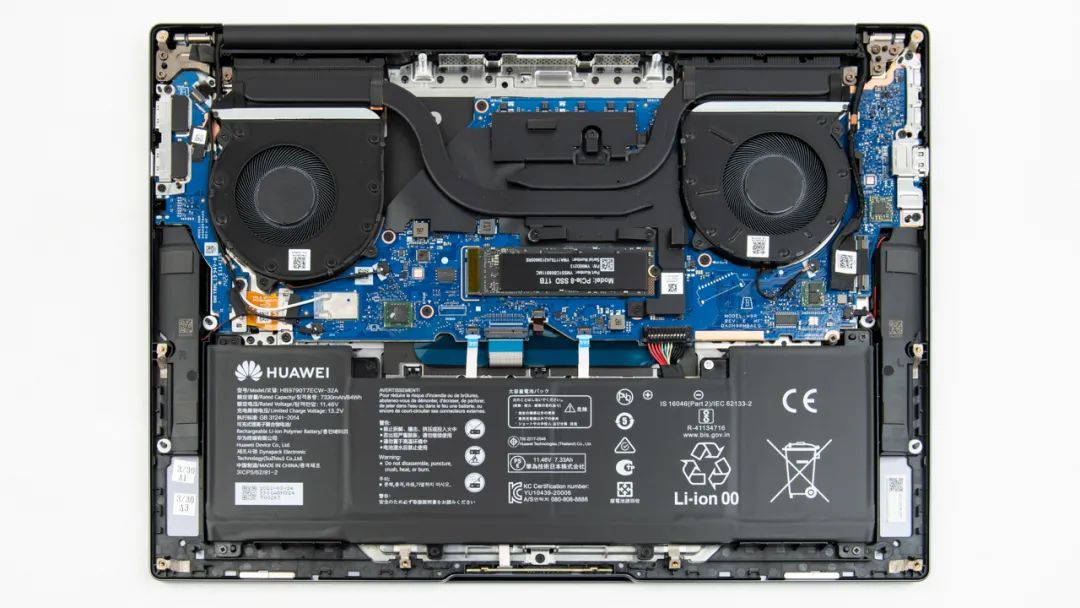 上图是MateBook 16s的拆机实拍图,双风扇双热管的组合,相比上一代取消了独显空焊位,调整了热管走向。