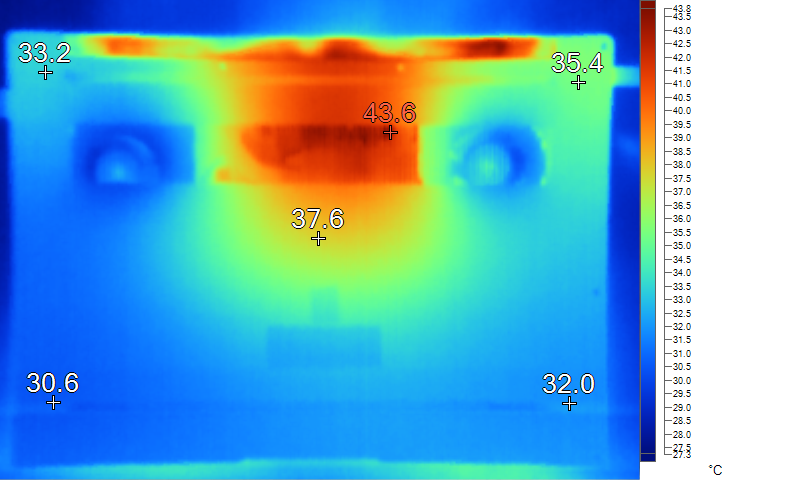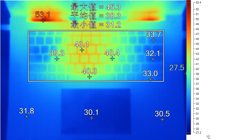 表面温度如上图所示,键盘键帽最高43.1℃出现在键盘中部,WASD键为39.3℃,方向键33℃。左腕托温度为31.8℃,背面中心点37.6℃。