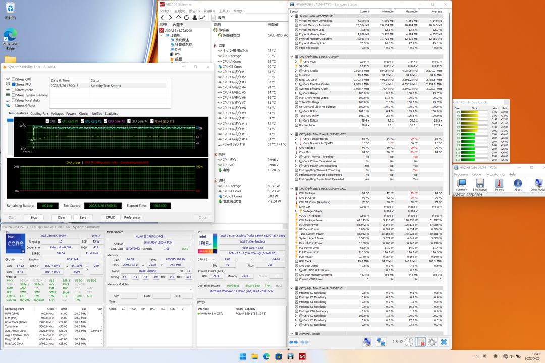 在满载状态下,CPU温度最高99℃,稳定在92℃,功耗约61W,P核频率3.1~3.2GHz,E核频率2.6GHz。