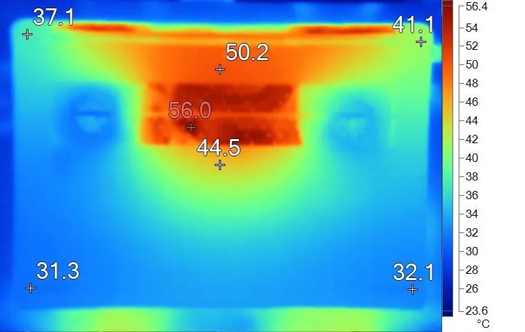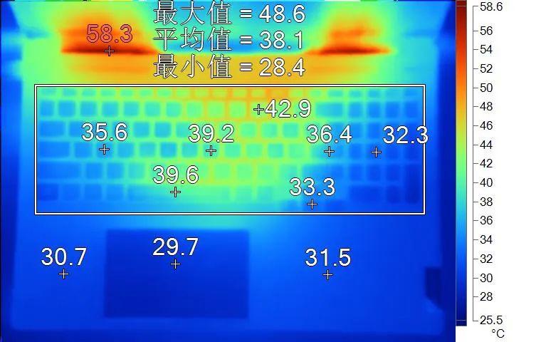 表面温度如上图所示,键盘键帽最高42.9℃出现在键盘上方数字键0键附近,WASD键为35.6℃,方向键33.3℃。左腕托温度为30.7℃,背面中心点44.5℃。