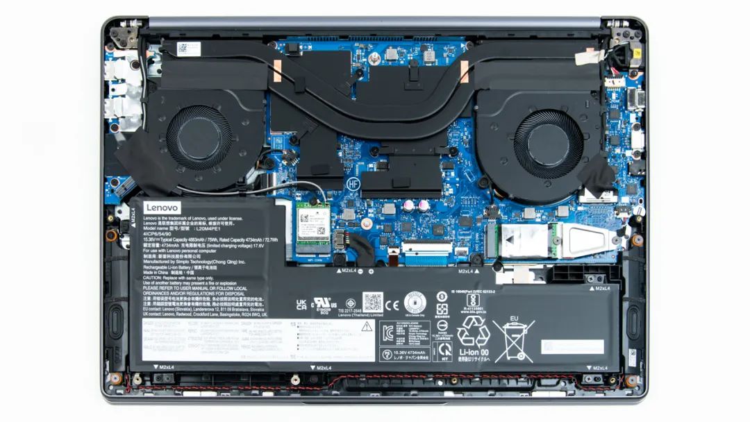 上图是联想小新Pro 16 2022锐龙版的拆机实拍图,双风扇双热管的组合。