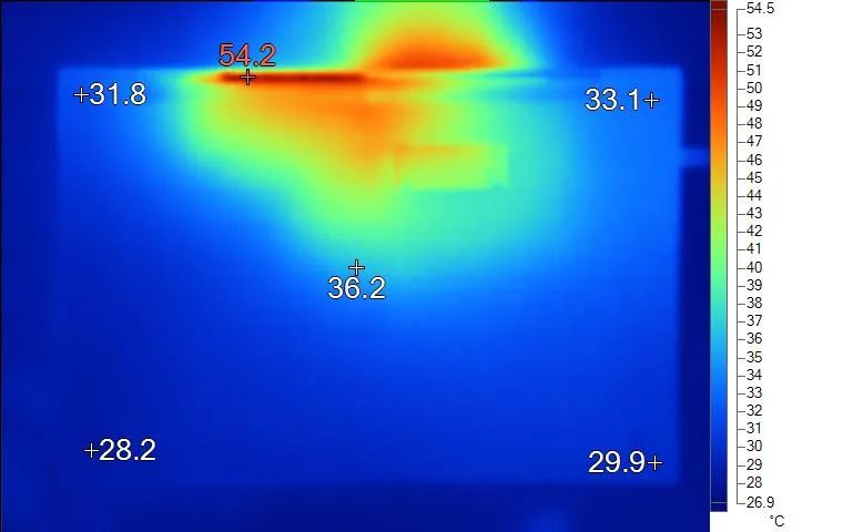 表面温度如上图所示,键盘键帽最高43.3℃出现在键盘Y键周围区域,WASD键为35.3℃,方向键27.8℃。左腕托温度为28.1℃,背面中心点36.2℃。