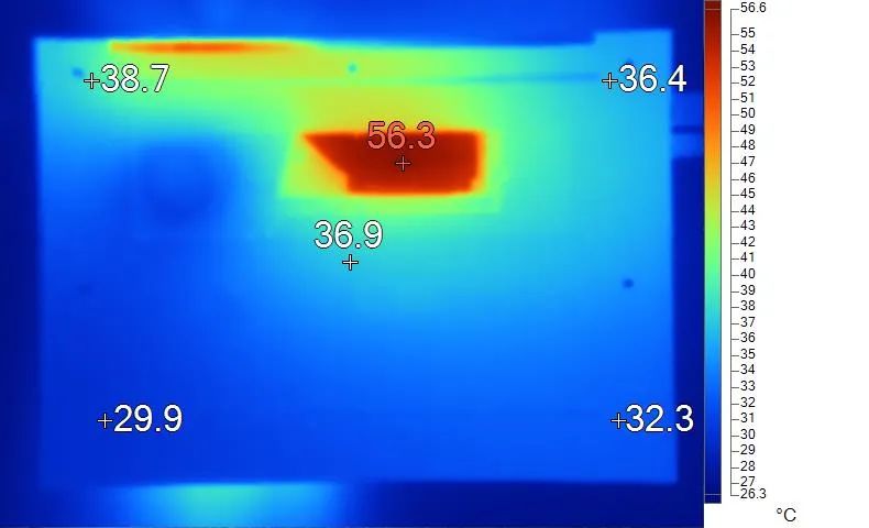 表面温度如上图所示,键盘键帽最高40.8℃出现在F键区域,WASD键为36.6℃,方向键29.7℃。左腕托温度为29.8℃,背面中心点36.9℃。
