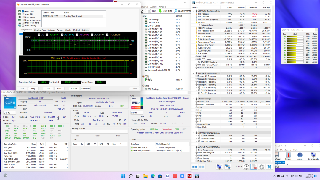 开启高能模式,在满载状态下,CPU温度最高96℃,稳定在77℃,功耗28W,P核频率维持在2.8GHz,E核频率维持在2.4GHz。
