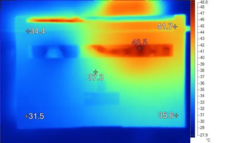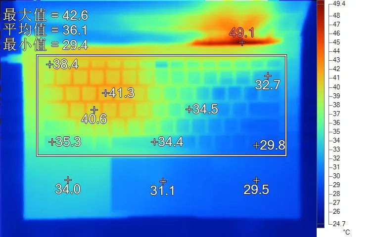 总的来说,华为 MateBook D14的散热表现不错,虽然高温区域集中在常用键区,但整体温度偏低,同时还能保持28W的性能释放,相比过去有进步。
