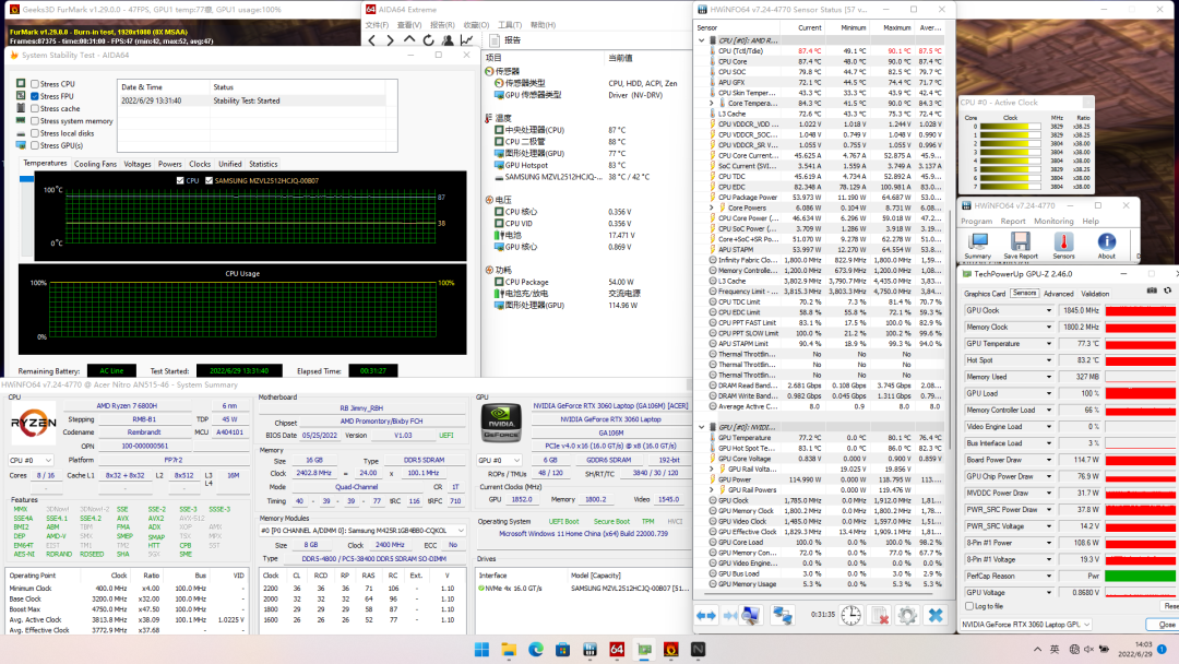 在满载状态下,开启性能模式进行双烤。
