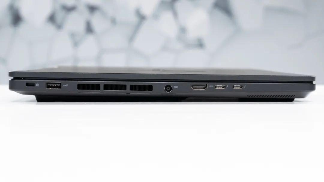 接口方面,机身左侧有依次USB3.2 Gen2 Type-A、电源口、HDMI2.1、双雷电4(支持100W PD充电和DP1.4视频输出);